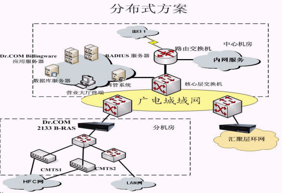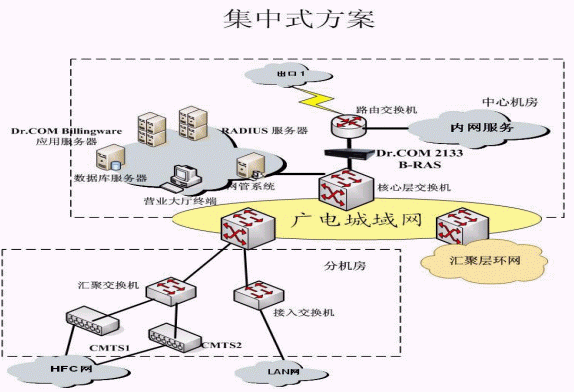 根據(jù)廣電城域網(wǎng)目前網(wǎng)絡的規(guī)模,以及以后的擴展,采用集中接入認證與計費,統(tǒng)一管理的方案,集中接入指:接入服務器部署在各個匯聚層的匯聚點,即在網(wǎng)絡出口安裝寬帶接入服務器,由寬帶接入服務器對所有用戶進行身份認證、接入控制、實時計費、數(shù)據(jù)采集,并將賬單和訪問日志等傳送至綜合業(yè)務系統(tǒng)。統(tǒng)一管理指在中心機房就可以進行全部的管理,包括:網(wǎng)絡設備管理;用戶管理;經(jīng)營策略管理;賬務管理;安全管理;數(shù)據(jù)分析。提供完整的用戶資料分析,使用習慣分析,運營統(tǒng)計等詳細分析報表。