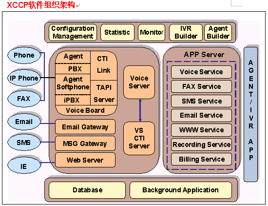 XCCP中自動(dòng)語(yǔ)音菜單是由VoiceXML語(yǔ)言組成的,這些VoiceXML頁(yè)面產(chǎn)生和存放都是在應(yīng)用服務(wù)器上進(jìn)行的;應(yīng)用服務(wù)器還存放應(yīng)用邏輯組件或中間件,進(jìn)行事務(wù)處理,IVR和座席子系統(tǒng)的業(yè)務(wù)處理都是通過(guò)這些事務(wù)處理來(lái)實(shí)現(xiàn)的;同后臺(tái)業(yè)務(wù)系統(tǒng)和數(shù)據(jù)庫(kù)通信,也是通過(guò)該模塊進(jìn)行的。
