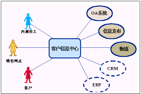 客戶信息中心有兩個層次的含義,首先它是一個信息中心,它應該可以訪問到后臺現(xiàn)有的各種系統(tǒng),如OA系統(tǒng)、信息發(fā)布系統(tǒng)、物流系統(tǒng),同時它還應該有良好的擴展性,可以和未來的其它系統(tǒng)相銜接,比如CRM系統(tǒng)、ERP系統(tǒng)相接;其次它是一個圍繞客戶的信息中心,它應該為客戶提供方便的信息交流手段,這就要求我們能夠通過多種媒介實現(xiàn)信息交互。