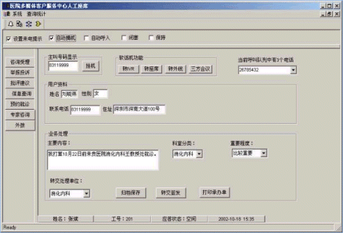。。系統(tǒng)通過計(jì)算機(jī)語音自動應(yīng)答設(shè)備或人工座席與患者建立聯(lián)系,檢索業(yè)務(wù)數(shù)據(jù)庫,既可以直接播放病人所需的咨詢信息、醫(yī)療費(fèi)用明細(xì)查詢、遠(yuǎn)程就診掛號,又可以接受患者的投訴舉報或求助,向醫(yī)院相關(guān)科室或負(fù)責(zé)人轉(zhuǎn)交相應(yīng)投訴建議或求助信息,使問題能夠在最快的時間內(nèi)得到最好的解決,這種交互式的服務(wù)模式和服務(wù)手段保證了溝通的靈活性和高效性,提高了患者對醫(yī)院的滿意度和信任度。