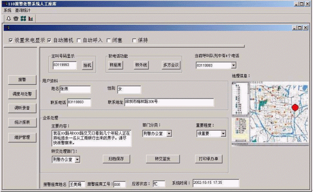 深圳博宇科技公司 110無線報(bào)警定位調(diào)度系統(tǒng)人工接警座席示意性界面如下: