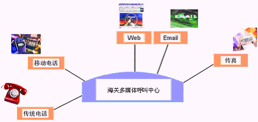 客戶利用電話、傳真、電子郵件、因特網(wǎng)、手機等撥打某一特服號碼(如9xxxx)進入海關(guān)多媒體呼叫中心系統(tǒng),本系統(tǒng)依托海關(guān)緝私相關(guān)的MIS系統(tǒng)、OA度系統(tǒng)等各類業(yè)務技術(shù)支持系統(tǒng)和網(wǎng)絡系統(tǒng),通過自動語音服務或人工受理等方式全天24小時不間斷地為客戶提供各種服務。
