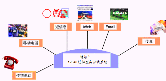 居民利用電話、傳真、手機等撥打某一特服號碼(如12348)進入地級市法律服務熱線系統(tǒng),本系統(tǒng)依托地級市司法行政部門/法院各類業(yè)務技術支持系統(tǒng)和網絡系統(tǒng),通過人工受理或自動語音服務等方式全天24小時不間斷地為人民群眾提供各種法律服務;形成了對外服務于百姓的無形窗口,對內管理、分析、決策系統(tǒng)相結合的多媒體呼叫中心。