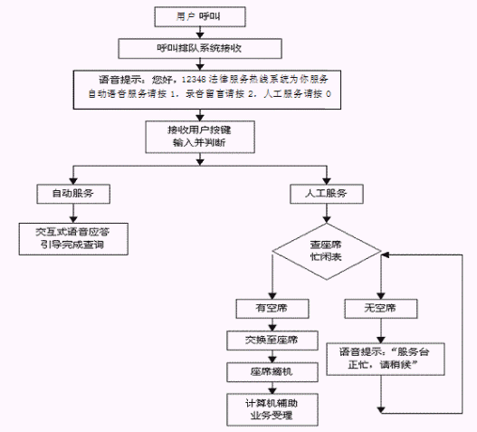 本系統(tǒng)將需轉入人工服務的用戶(電話)語音線路,根據一定的分配算法,將人民群眾打入的電話合理地分配給后臺的座席操作人員進行處理,使系統(tǒng)的工作得以合理的分配。