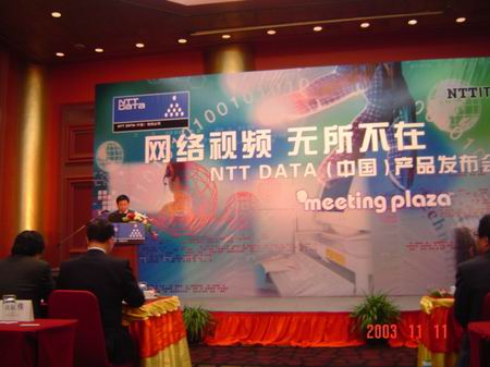 2003年11月11日,NTT DATA(中國)有限公司,在長城飯店舉行了名為“網(wǎng)絡視頻——無所不在”的產(chǎn)品發(fā)布會。會上,NTT DATA(中國)有限公司正式推出了一款網(wǎng)絡視頻軟件產(chǎn)品——“MeetingPlaza”。此產(chǎn)品開拓了視頻系統(tǒng)在圖像效果、控制靈活度以及性價比上的全新應用模式。該產(chǎn)品的開發(fā)商NTT-IT,自2001年6月起在日本開始系統(tǒng)的銷售及提供ASP服務。到現(xiàn)在已經(jīng)向500家以上的日本企業(yè)及地方政府提供了服務,在日本深受好評。在中國,雖然軟件視頻會議系統(tǒng)還處在起步階段,但依據(jù)未來視頻通訊的廣大需求,以及“MeetingPlaza”具有的投入成本低、限制少和適用性強的特點,都將使該產(chǎn)品更加具有市場潛力。
