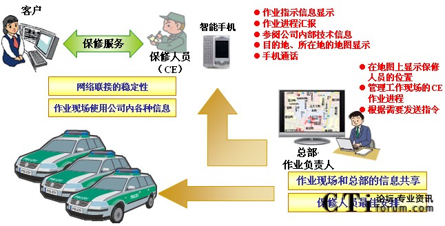 “MoBiz AP for CE支持系統(tǒng)”在加強(qiáng)總部和現(xiàn)場(chǎng)維修人員的聯(lián)動(dòng)基礎(chǔ)上,通過(guò)準(zhǔn)確把握地點(diǎn)信息和作業(yè)進(jìn)展?fàn)顩r,有效安排工作人員,從而達(dá)到提高工作人員一天的工作現(xiàn)場(chǎng)訪問(wèn)次數(shù)。進(jìn)一步說(shuō),有助于客戶SLA(注3)的遵守和客戶滿意度(CS)的提高。