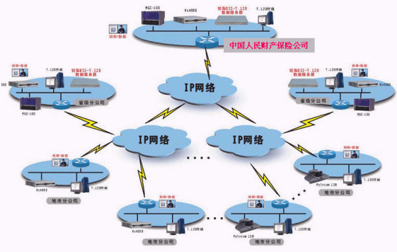 中國人民財產(chǎn)保險股份有限公司,是中國內(nèi)地最大的非壽險公司,香港證交所上市公司。經(jīng)過50多年的發(fā)展,中國人保財險公司已經(jīng)發(fā)展成為網(wǎng)點遍布全國31個省市區(qū),共有營業(yè)機構(gòu)4000余個的大型商業(yè)公司。為提高辦公效率,降低差旅成本,中國人保財險公司決定建設(shè)覆蓋從總公司、省分公司到地市分公司的視頻會議系統(tǒng),項目總?cè)萘窟_600多個節(jié)點,采用兩級級連方式組網(wǎng),要求系統(tǒng)具備視頻、音頻、數(shù)據(jù)交互功能,。