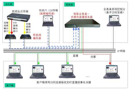 同時系統(tǒng)具備直播、點播功能,用戶使用IE瀏覽器即可接收會議的實時直播或進行事后點播,通過直播或點播可同步觀看到會議中視音頻和數(shù)據(jù)內(nèi)容,觀看會議的效果如同身處會場之后。會易錄極大地擴展了視頻系統(tǒng)的功能和應用,適合任何已有或擬建視頻會議系統(tǒng)的用戶使用。