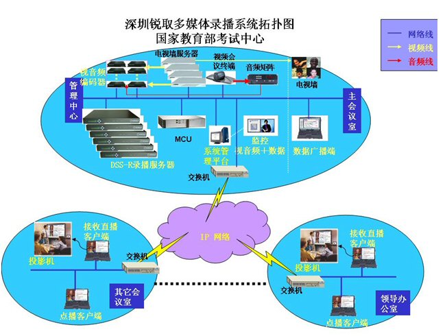 國家教育部考試中心為了對高考等大型考試實時性指導(dǎo)、監(jiān)考、培訓(xùn)等,特建立了視頻會議系統(tǒng)、監(jiān)考系統(tǒng)。為了使整個系統(tǒng)更完善、應(yīng)用價值更高,因此在此基礎(chǔ)上配置了銳取多媒體錄播系統(tǒng)。不僅實現(xiàn)了與各地考試中心及考點的圖像、語音和數(shù)據(jù)的交互通訊,還可以輔助系統(tǒng)完成視頻會議、監(jiān)考系統(tǒng)及培訓(xùn)的錄制、直播和點播功能,錄制、直播和點播的內(nèi)容包括了所有考試中心、考點圖像以及聲音和數(shù)據(jù)信號。