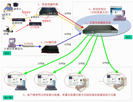 通過(guò)服務(wù)器內(nèi)置單播或組播功能方式將會(huì)議現(xiàn)場(chǎng)的視頻、音頻、計(jì)算機(jī)屏幕上的圖像內(nèi)容和過(guò)程在網(wǎng)絡(luò)上進(jìn)行實(shí)時(shí)直播,用戶(hù)可通過(guò)IE瀏覽器登錄服務(wù)器實(shí)時(shí)接收會(huì)議現(xiàn)場(chǎng)的視頻、音頻和計(jì)算機(jī)動(dòng)態(tài)屏幕內(nèi)容,也可以選擇性的直播部分媒體流,直播延時(shí)小。同時(shí)系統(tǒng)獨(dú)家支持組播代理功能,無(wú)須更改網(wǎng)絡(luò)設(shè)備設(shè)置的即可實(shí)現(xiàn)跨網(wǎng)段的組播。