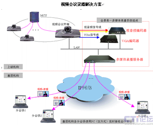 如圖所示,上級機構(gòu)視音頻編碼器接在視音頻源上,對視音頻信號采集,VGA編碼器采集VGA信號,通過網(wǎng)絡(luò)傳給放在機房的多媒體錄播服務(wù)器。基層機構(gòu)的各個分會場通過IE瀏覽器的方式接受會議直播。