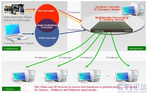 Encoder可用于采集高清視頻的信號或者VGA的信號。前臺的編碼器編碼好通過IP網(wǎng)絡(luò)傳送到服務(wù)器Multimedia