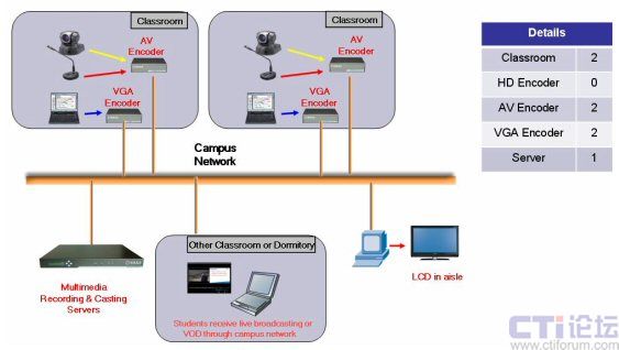 如上圖所示,服務(wù)器型號為DSS-R-T2,T系列的產(chǎn)品是銳取公司專門應(yīng)用于教育行業(yè)的產(chǎn)品。T2可支持兩個教室的同時錄制與直播,放置在學(xué)校數(shù)據(jù)中心的機房中。兩個AV Encoder和兩個VGA Encoder分別放置在需要做錄制直播的教室中。學(xué)生通過校園網(wǎng)或者Internet連接到服務(wù)器即可收看多媒體教學(xué)的直播,包括老師的圖像聲音以及講解的課件內(nèi)容。在教學(xué)樓中,每一層的走廊里都安裝了大的LCD顯示屏,服務(wù)器上的多媒體內(nèi)容也將同時傳到這些顯示屏上。