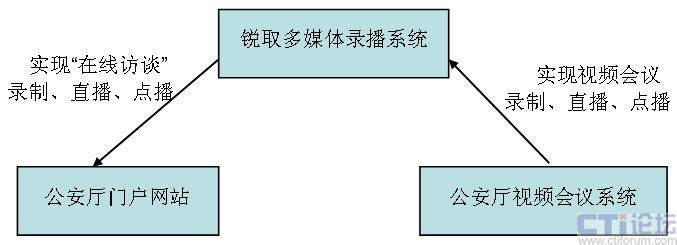 如圖所示,銳取多媒體錄播系統(tǒng)前端的視音頻編碼器采集視頻會(huì)議系統(tǒng)攝像機(jī)拍攝的公安機(jī)關(guān)領(lǐng)導(dǎo)或?qū)<以诰交流的視頻圖像和交流現(xiàn)場(chǎng)的聲音,將采集的視頻和音頻信號(hào)通過網(wǎng)絡(luò)傳輸?shù)胶笈_(tái)的多媒體錄播服務(wù)器中。服務(wù)器的錄制模塊將從視音頻編碼器接收到的信號(hào)進(jìn)行同步組合錄制,錄制的文件存儲(chǔ)在服務(wù)器的硬盤上。服務(wù)器的點(diǎn)播模塊調(diào)用硬盤中已錄制的文件實(shí)現(xiàn)點(diǎn)播功能。服務(wù)器的直播模塊將從視音頻編碼器接收到的信號(hào)分發(fā)到網(wǎng)絡(luò)上,需要觀看“在線訪談”直播視頻的網(wǎng)民只需登錄省公安廳政府門戶網(wǎng)站,安裝專用客戶端軟件就能接收到公安機(jī)關(guān)領(lǐng)導(dǎo)或?qū)<以诰交流的實(shí)時(shí)內(nèi)容。通過客戶端軟件的在線交流功能,觀看直播的網(wǎng)民還可以向公安機(jī)關(guān)領(lǐng)導(dǎo)或?qū)<姨釂枺嬲龑?shí)現(xiàn)了“在線訪談”貼近群眾、服務(wù)群眾的目標(biāo)。