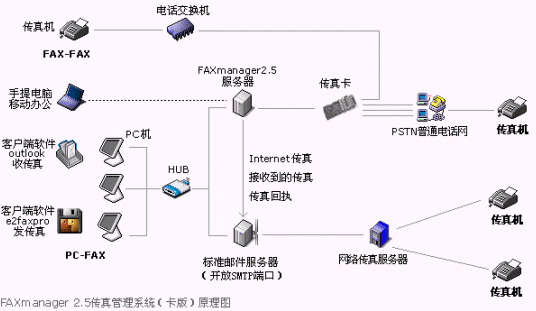 FAXmanager 2.5傳真管理系統(tǒng)安裝在局域網(wǎng)的一臺專用服務(wù)器上,運行環(huán)境可以是:Windows98/NT/2000/XP等,此服務(wù)器可以同郵件服務(wù)器為同一臺機器,構(gòu)成企業(yè)郵件/傳真專用服務(wù)器,F(xiàn)AXmanager 2.5可以和企業(yè)郵件系統(tǒng)或群件系統(tǒng)整合使用,可以是Unix/Linux環(huán)境的Qmail和Sendmail等郵件系統(tǒng),也可以是Microsoft Exchange和Lotus Domino/Notes等群件系統(tǒng),當(dāng)然也可以是IComMail等企業(yè)郵件系統(tǒng),也支持虛擬主機設(shè)置企業(yè)郵局開設(shè)POP3帳戶和上網(wǎng)代理服務(wù)器的使用環(huán)境。