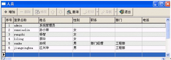 人員管理主要是對(duì)本系統(tǒng)的使用者進(jìn)行管理(增加/修改/刪除/查詢),包括使用者所在的部門、職務(wù)等