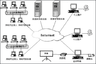會議帶寬管理 可以設置會議所需要的網(wǎng)絡帶寬,當客戶端連接到服務器后,將根據(jù)服務器設定的會議帶寬決定本地視頻采集的幀率。例如,如果服務器設定的會議帶寬為56Kbps,則所有連接到服務器的客戶端將以1~3幀/秒的幀率進行視頻采集;如果服務器設定的會議帶寬為256Kbps,則所有連接到服務器的客戶端將以8~10幀/秒的幀率進行視頻采集。由于上網(wǎng)條件與網(wǎng)絡環(huán)境的千差萬別,設定固定的會議帶寬有利于保證會議的正常穩(wěn)定進行(系統(tǒng)結(jié)構(gòu)如下圖所示)。