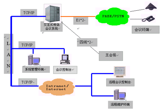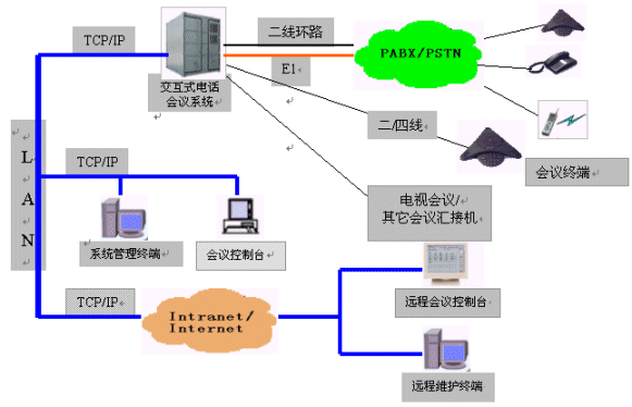 MCU-NT/I交互式電話會(huì)議系統(tǒng)為會(huì)議用戶提供了強(qiáng)大靈活的會(huì)議功能和豐富完善的網(wǎng)管功能。會(huì)議功能是在會(huì)議終端(或話機(jī))和會(huì)議控制臺(tái)上實(shí)現(xiàn)的;網(wǎng)管功能是在系統(tǒng)維護(hù)終端上實(shí)現(xiàn)的,并在靈活的組網(wǎng)方式中體現(xiàn)出它的方便易用。系統(tǒng)可以外接多個(gè)會(huì)議控制臺(tái)及多個(gè)系統(tǒng)維護(hù)終端,并且可以通過企業(yè)網(wǎng)或互聯(lián)網(wǎng)的遠(yuǎn)程連接,因此,所有功能都是可以遠(yuǎn)程實(shí)現(xiàn)的。
