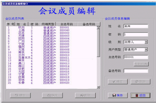 ·成員編輯:即設(shè)置會(huì)議成員數(shù)據(jù)。進(jìn)行會(huì)議操作之前必須先設(shè)置會(huì)議成員數(shù)據(jù)。會(huì)議成員數(shù)據(jù)包括:人員姓名、常用號(hào)碼、備用號(hào)碼、密碼、級(jí)別(會(huì)議主持人、發(fā)言人、聽眾)。會(huì)議主持人一個(gè),會(huì)議成員個(gè)數(shù)不限,但總數(shù)不超過180個(gè)。