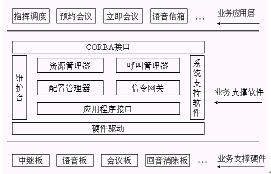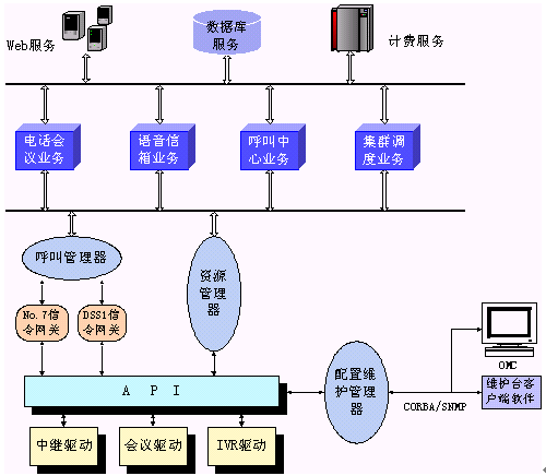 。。其中呼叫管理器通過CORBA技術向業(yè)務層提供2個軟件接口,資源管理器通過CORBA向業(yè)務層提供6個軟件接口。