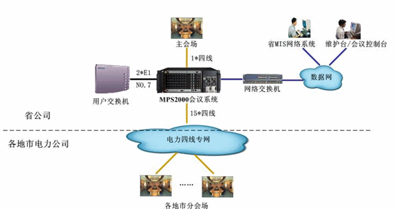 該會議系統(tǒng)是安徽省公司與地市電力公司“一主兩備”系統(tǒng)的電話會議系統(tǒng)備份系統(tǒng),通過2個數(shù)字中繼與省通信公司用戶交換機(jī)互連,采用NO.7信令。16路4線中1路接主會場調(diào)音臺,實現(xiàn)會議室擴(kuò)音設(shè)備的接入,其余15路接各地市電力公司原四線專網(wǎng)資源連接,通過以太網(wǎng)口與D-LINK網(wǎng)絡(luò)交換機(jī)互連,接入安徽省電力的數(shù)據(jù)網(wǎng),實現(xiàn)實時維護(hù)管理及會議控制等功能。