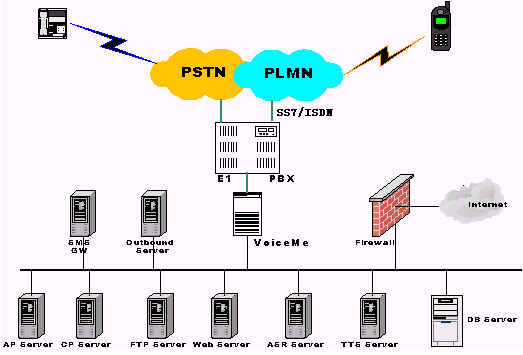 整個(gè)系統(tǒng)平臺(tái)前端接入可直接從電信或移動(dòng)交換機(jī)提供的信號(hào)接入,如中國一號(hào)、SS7以及ISDN等,通過PBX連入平臺(tái)核心VoiceMe服務(wù)器,系統(tǒng)接入容量可擴(kuò)至幾十個(gè)乃至上百個(gè)E1接入。系統(tǒng)主要包括語音控制、多媒體應(yīng)用和內(nèi)容管理等部分,其中主要包括: