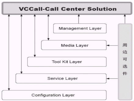 Media Layer由VCCall/DBBridge、VCGate(Option)、VCCall/FAX、VCCall/TXT2FAX、VCCall/FAX、VCCall/TXT2FAX組成VCCall媒體層提供了除電話之外進行交互的其他媒體組件,包括:傳真VCCall/FAX、數(shù)據(jù)庫訪問媒體VCCall/DBBridge。