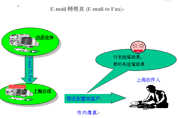 特別值得一提的是,E-mail轉(zhuǎn)傳真功能還能節(jié)省很多長(zhǎng)途電話費(fèi),如李先生出差在香港,需要將傳真發(fā)回公司所在地上海的客戶,通過E-mail將傳真發(fā)送到上海公司的伺服器,伺服器再將傳真發(fā)送到李先生上海的客戶處,如此一來,國(guó)際長(zhǎng)途傳真只收市話費(fèi),何樂而不為呢?!
