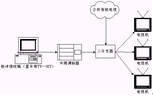 本系統(tǒng)接收端接收實(shí)時(shí)廣播時(shí),除了用普通PC機(jī)收看,或把PC機(jī)接收到的信號(hào)輸?shù)诫娨暎ù笃粒┥鲜湛,甚至還可以接入有線電視網(wǎng)進(jìn)行播放。具體方法是通過(guò)一個(gè)接收端接收股評(píng)節(jié)目,通過(guò)帶TV-OUT的顯卡把TV信號(hào)輸出到中頻調(diào)制設(shè)備,中頻調(diào)制設(shè)備可以把基帶模擬信號(hào)轉(zhuǎn)換成一個(gè)有線電視信號(hào),且傳輸距離遠(yuǎn),損失小,再把這個(gè)信號(hào)與有線電視信號(hào)一起接入一個(gè)二分支器(2進(jìn)1出),這就可以和公共有線電視共存,形成自己的頻道,供電視接收。