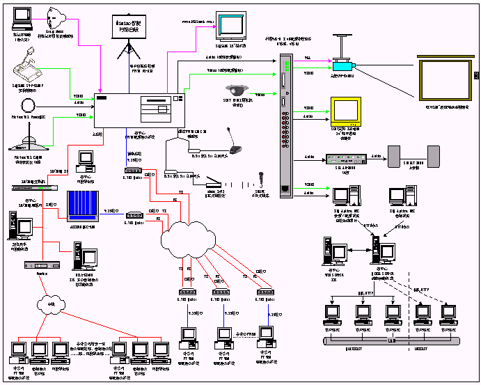 1、 電視會(huì)議系統(tǒng)包括一臺(tái)MCU和13臺(tái)iPower900,通過(guò)IP網(wǎng)絡(luò)和E1專線兩種線路連接。為了將視頻會(huì)議的功能進(jìn)行擴(kuò)展,我們?cè)黾恿硕喾N外圍設(shè)備,包括:實(shí)物投影儀、白板掃描儀、無(wú)線話筒、DV31攝像機(jī)等輸入設(shè)備,彩色電視機(jī)、三菱投影機(jī)和功放、音箱等輸出設(shè)備以及8×4視頻切換矩陣。