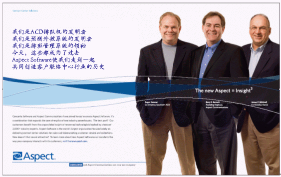我們可以看到全新的Aspect Software將會給我們的客戶、合作伙伴以及我們的員工帶來更大的利益,我們擁有廣泛的解決方案、強(qiáng)大的研發(fā)團(tuán)隊以及支持隊伍,Aspect將會緊密地與您合作,在發(fā)展和實(shí)施呼叫中心解決方案的同時持續(xù)給您的業(yè)務(wù)帶來新的價值。