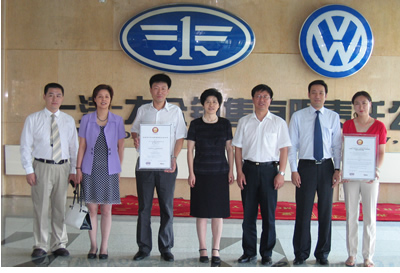 中國(guó)信息化推進(jìn)聯(lián)盟秘書長(zhǎng)劉獻(xiàn)軍向一汽-大眾頒發(fā)證書