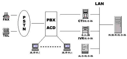 在大型CALL CENTER系統(tǒng)的設計中,這是以往最常用的方案。交換機由于其電信級標準的設計,接入容量大、交換處理能力強、性能穩(wěn)定,因而往往被大、中型呼叫中心用在前端構(gòu)成ACD系統(tǒng)(自動呼叫分配系統(tǒng))用來處理排隊、路由管理、坐席管理等功能。但是由于傳統(tǒng)交換機在語音資源、傳真資源等呼叫中心基本信息資源處理能力方面的匱乏,必須通過語音板卡和PC機的方式解決,有時因為系統(tǒng)容量大,甚至需要多臺共同服務,因此,其IVR(交互式語音應答)和CTI服務器卻只能達到PC機標準,影響整體性能穩(wěn)定性。另外,由于交換機和IVR、CTI等之間的相互連接會受其密合程度和其他如電磁干擾、鼠啃蟻咬等外來因素影響,同樣會造成一些不可預知的系統(tǒng)故障。同時,PBX+CTI服務器的建設成本也非常高。