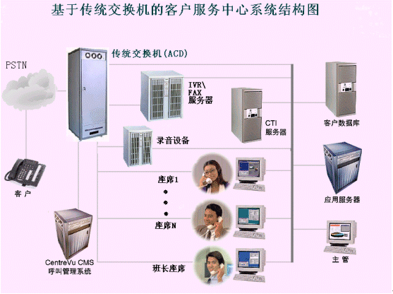 但是由于傳統(tǒng)交換機(jī)在語(yǔ)音資源、傳真資源等呼叫中心基本信息資源處理能力方面的匱乏,必須通過(guò)語(yǔ)音板卡和PC機(jī)的方式解決,有時(shí)因?yàn)橄到y(tǒng)容量大,甚至需要多臺(tái)共同服務(wù),其IVR(交互式語(yǔ)音應(yīng)答)和FAX、CTI服務(wù)器卻只能達(dá)到PC機(jī)標(biāo)準(zhǔn)。所以開發(fā)出的系統(tǒng)雖然前置交換為電信級(jí)的標(biāo)標(biāo)準(zhǔn),但是其整體性能、穩(wěn)定性仍受PC插卡方式的影響。另外,由于交換機(jī)和IVR、FAX、CTI等之間的相互連接會(huì)受其密合程度和其他外來(lái)因素影響,會(huì)造成一些不可預(yù)知的系統(tǒng)故障。不僅交換機(jī)+CTI服務(wù)器+IVR服務(wù)器(語(yǔ)音板卡+PC機(jī))+傳真服務(wù)器(傳真卡+PC機(jī))+錄音模塊設(shè)備(監(jiān)控錄音卡+PC機(jī))的建設(shè)成本非常高,并且編程開發(fā)較復(fù)雜。