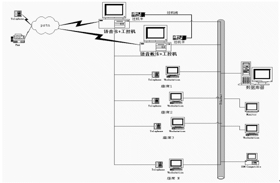 在一些小型CALL CENTER系統(tǒng)中,人們通常通過(guò)語(yǔ)音板卡加工控機(jī)的方式搭建系統(tǒng),通常一臺(tái)設(shè)備就集成了ACD、IVR、CTI等各種資源,各資源的使用、調(diào)派通過(guò)軟件進(jìn)行控制,有效的解決了建設(shè)成本高、系統(tǒng)構(gòu)造繁復(fù)的問(wèn)題,具有相當(dāng)?shù)撵`活性。然而由于工控機(jī)和語(yǔ)音板卡容量有限,同時(shí)其標(biāo)準(zhǔn)最多只能是工業(yè)級(jí)標(biāo)準(zhǔn),因此在構(gòu)建相對(duì)大型的呼叫中心時(shí)就總是捉襟見肘。為了增加系統(tǒng)容量,解決多臺(tái)PC之間進(jìn)行通道交換的難題,人們又設(shè)計(jì)了過(guò)機(jī)卡和過(guò)機(jī)線來(lái)解決,其應(yīng)用系統(tǒng)如下圖: