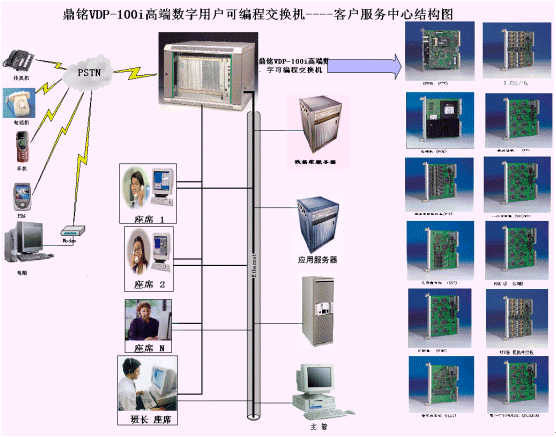接入平臺(tái)實(shí)現(xiàn)外界接入的控制和話務(wù)交換、資源的合理分配,是構(gòu)建呼叫中心的成功關(guān)鍵所在。DM大型呼叫中心系統(tǒng)接入平臺(tái)采用鼎銘VDP-100i高端數(shù)字可編程交換機(jī),該交換機(jī)所有資源板卡都采用了高集成度、功能模塊設(shè)計(jì)思想。該接入平臺(tái)的結(jié)構(gòu)如上圖所示的右邊(詳細(xì)的功能模塊資源板請(qǐng)參閱《鼎銘高端數(shù)字可編程交換機(jī)產(chǎn)品手冊(cè)》),用戶可以根據(jù)實(shí)際情況靈活配置和增減系統(tǒng)的接入方式、資源類型、資源數(shù)量,達(dá)到資源的充分合理利用的目的。