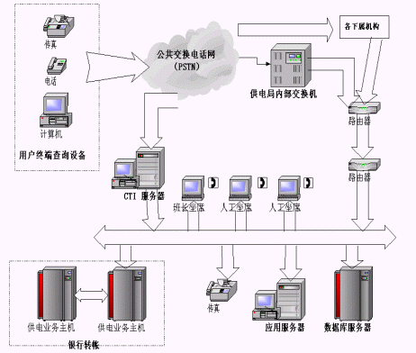 (3)自動轉(zhuǎn)人工服務(wù)。系統(tǒng)還可自動轉(zhuǎn)接人工坐席,由電力專業(yè)人員負(fù)責(zé)解答和處理客戶意見;蛘邔⒖蛻舴⻊(wù)中心系統(tǒng)與后臺數(shù)據(jù)庫服務(wù)器相接,通過客戶提供的相關(guān)信息,為客戶提供個性化的在線服務(wù)。