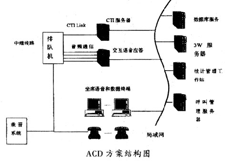 這種方案的核心思想是在專用交換機+ACD的基礎(chǔ)上擴展路由和統(tǒng)計的功能,開放CTI -Link接口,用CTI技術(shù)實現(xiàn)通信和計算機的功能結(jié)合,再配以必要的語音和數(shù)據(jù)庫系統(tǒng),從而以強大的通信和計算機功能滿足呼叫中心的要求。