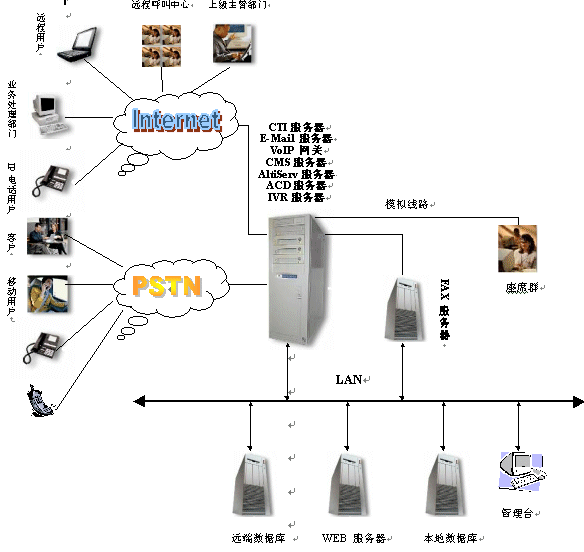 另一方面,CTI(計算機語音集成)技術的出現,實現了通信技術與計算機技術的結合,利用計算機技術可以大大增加服務的信息量、提高速度、拓展新型客戶服務業(yè)務。因此為了滿足計算機、信息技術的演進和客戶服務的需求,利用CTI技術,面向用戶,提供綜合服務的客戶服務中心系統(tǒng)應運而生。對于用戶,客戶服務中心系統(tǒng)能夠提供更優(yōu)質的用戶服務,用戶能從服務方得到最快的響應,能夠得到24小時的持續(xù)服務,能夠同時得到語音、圖象、數據多方面的信息支持。對于企業(yè),客戶服務中心在提高客戶服務質量的同時,還能有效的控制成本、增加收入,樹立專業(yè)化的企業(yè)形象,建立完善的客戶服務資料庫。