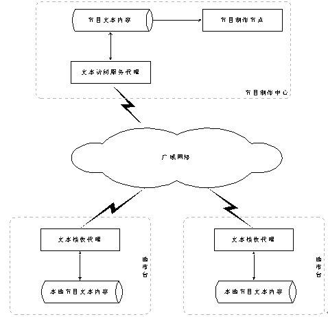 單一的節(jié)目制作中心一般放置在省中心。在節(jié)目制作中心,節(jié)目數(shù)據(jù)以數(shù)據(jù)庫或者文本文件的方式存放于節(jié)目數(shù)據(jù)倉庫中。在節(jié)目制作中心運(yùn)行文本訪問服務(wù)代理,接受各地市臺(tái)的數(shù)據(jù)請(qǐng)求并發(fā)送相應(yīng)的數(shù)據(jù)。各個(gè)地市臺(tái)通過文本請(qǐng)求、接收代理向中心請(qǐng)求或者接收文本數(shù)據(jù),存放于本地?cái)?shù)據(jù)倉庫,等待語音合成服務(wù)器合成成語音文件,地市臺(tái)使用合成后的語音文件迅速開通相應(yīng)的節(jié)目。