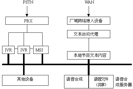 離線合成可以與省級(jí)甚至全國聲訊網(wǎng)絡(luò)結(jié)合,開發(fā)出靈活的聯(lián)網(wǎng)業(yè)務(wù)。即文本訪問代理從廣域網(wǎng)上取得節(jié)目文本數(shù)據(jù)存放于本地的文本數(shù)據(jù)共享目錄,語音合成服務(wù)器通過訪問該目錄獲取節(jié)目文本合成為語音文件存放與服務(wù)器的語音文件共享目錄中。局域網(wǎng)內(nèi)其他設(shè)備(IVR、MSI等等)訪問語音文件共享目錄,向用戶播放最新生成的語音信息。