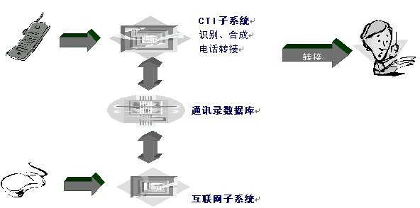 Internet子模塊相對比較簡單,可以采用目前主流的網(wǎng)絡通訊錄服務方式進行服務;而為了更好服務用戶,CTI子模塊需要采用先進的語音合成和語音識別技術(shù)。