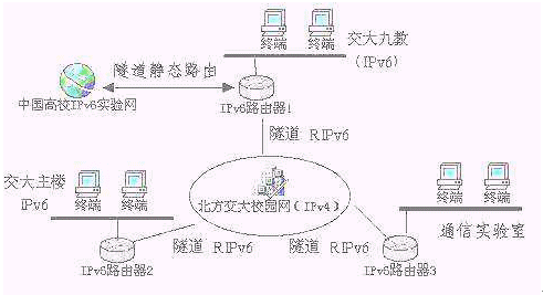 FH6501(IPv6路由器)已經(jīng)在北方交通大學(xué)學(xué)生IPv6實(shí)驗(yàn)床實(shí)際安全運(yùn)行了六個(gè)月。北方交通大學(xué)學(xué)生IPv6實(shí)驗(yàn)床采用我公司IPv6路由器產(chǎn)品,架構(gòu)了三個(gè)主節(jié)點(diǎn),借助隧道連接到由Nokia資助建設(shè)的中國(guó)高校IPv6實(shí)驗(yàn)床。目前三個(gè)主節(jié)點(diǎn)之間的連接是借助于學(xué)校原有的IPv4網(wǎng)絡(luò),通過隧道技術(shù)實(shí)現(xiàn)節(jié)點(diǎn)間的通信(見圖示)。