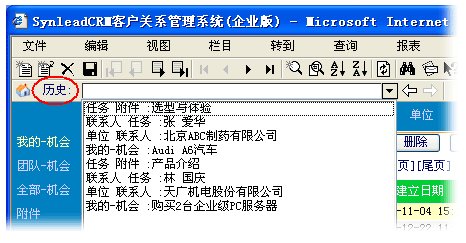 有必要回顧SynleadCRM先前解決數(shù)據(jù)森林穿行問題的重要方法——“歷史”記憶功能,它今后將與新增的“線程”向?qū)Ч餐瑤椭脩粲稳杏杏嗟夭僮鰿RM。