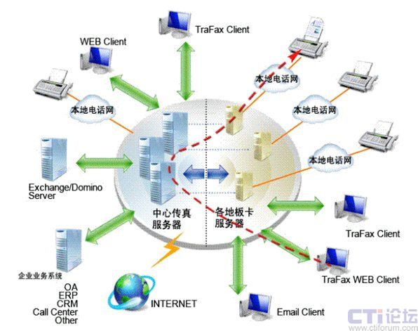 應(yīng)用TraFax Enterprise Server拓敏傳真服務(wù)器系統(tǒng)企業(yè)版所部署的中心傳真服務(wù)器同時(shí)支持本地、異地多板卡服務(wù)器接入,從而使集團(tuán)企業(yè)的傳真資源能夠?qū)崿F(xiàn)真正高效、安全的集中管理,員工可以從他們的電腦桌面直接收發(fā)、瀏覽、編輯、轉(zhuǎn)發(fā)以及查找傳真文件。服務(wù)器接收的傳真自動(dòng)分發(fā)給正確的接收人,支持語音提示、能夠與當(dāng)前幾乎所有主流應(yīng)用系統(tǒng)進(jìn)行無縫集成,支持雙機(jī)熱備份,具有高度的系統(tǒng)可靠性。