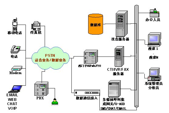 本方案采用西門子HiPath3750交換機(jī),通過(guò)強(qiáng)訊中間件控制整個(gè)呼叫中心的電話呼入、呼出。它支持多種聯(lián)絡(luò)渠道,包括語(yǔ)音、交互式自動(dòng)語(yǔ)音應(yīng)答(IVR)、傳真、短消息。