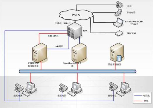 呼叫中心前端通信平臺(tái),主要由SIEMENS HiPath3800交換機(jī),計(jì)算機(jī)電話集成服務(wù)器(UltraCTI),交互式語(yǔ)音應(yīng)答服務(wù)器(ctsIVR),在線錄音監(jiān)聽服務(wù)器(SmartLog),數(shù)據(jù)庫(kù)服務(wù)器,MCI服務(wù)器以及傳真服務(wù)器幾個(gè)部分組成。中繼線采用30B+D接入。
