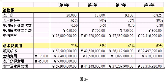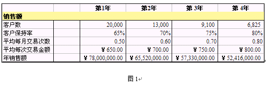= ¥78,000,000.00。隨著時(shí)間的推移,保留下來的老客戶平均每個(gè)月的交易次數(shù)逐步從0.50次上升到0.80次,而且每次采購的金額也逐步從¥650.00提高到¥800.00;但是由于這一組客戶的數(shù)量不斷減少,年銷售額逐步從¥78,000,000.00下降到了¥52,416,000.00。
