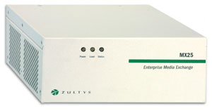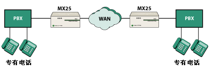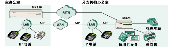 MX25 是一種能夠在兩種不同模式下工作的模塊化設(shè)備。在其中一種工作模式下,MX25 是一個(gè)通向 PSTN 網(wǎng)關(guān)的獨(dú)立 SIP。當(dāng)在這種模式下工作時(shí),MX25 轉(zhuǎn)換電話呼叫的格式,使其可以在 IP 網(wǎng)絡(luò)與公用電話網(wǎng)絡(luò)之間傳遞。另一種工作模式是,將 MX25 作為 MX250 的功能延伸系統(tǒng),用于不超過(guò) 25 個(gè)用戶的分支辦公室。在這種配置下,MX25 與 MX250 通信并交換有關(guān)用戶和設(shè)備的信息。即使連接 MX250 和 MX25 的 WAN 鏈路出現(xiàn)故障,MX25 也能繼續(xù)工作并處理來(lái)自/發(fā)往 PSTN 的傳入/傳出呼叫。