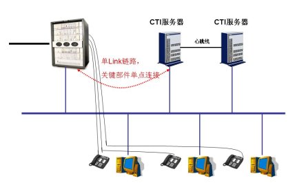 中汽網(wǎng)呼叫中心采用了Hi-Link產(chǎn)品的鏈路級雙機熱備解決方案,為核心部件CTI提供真正可靠的保障。以往的CTI產(chǎn)品在與PBX連接的時候,都是采用PBX廠家提供的“API層”接口,該接口只能部署到一臺服務(wù)器上,進而也使得采用雙機熱備方案的CTI服務(wù)器存在單點故障,如圖所示: